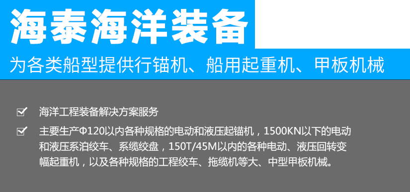 江蘇海泰海洋裝備有限公司位于素稱“銀杏之鄉(xiāng)”的泰興市,2018年投資建設,至今已經(jīng)成為產(chǎn)品研發(fā)、生產(chǎn)制造,調試服務為一體的設備配套企業(yè)。公司從事海洋裝備(設備)及配件的制造、設計、安裝,維修;船用錨機、絞車、起重機、舾裝件、電氣設備、環(huán)保設備設計、制造。公司成立以來,就與中國船舶工業(yè)集團公司第701所、702所、704所、708所、上海船舶研究設計院等多家船舶科研院所建立了技術合作關系,產(chǎn)品應用于......